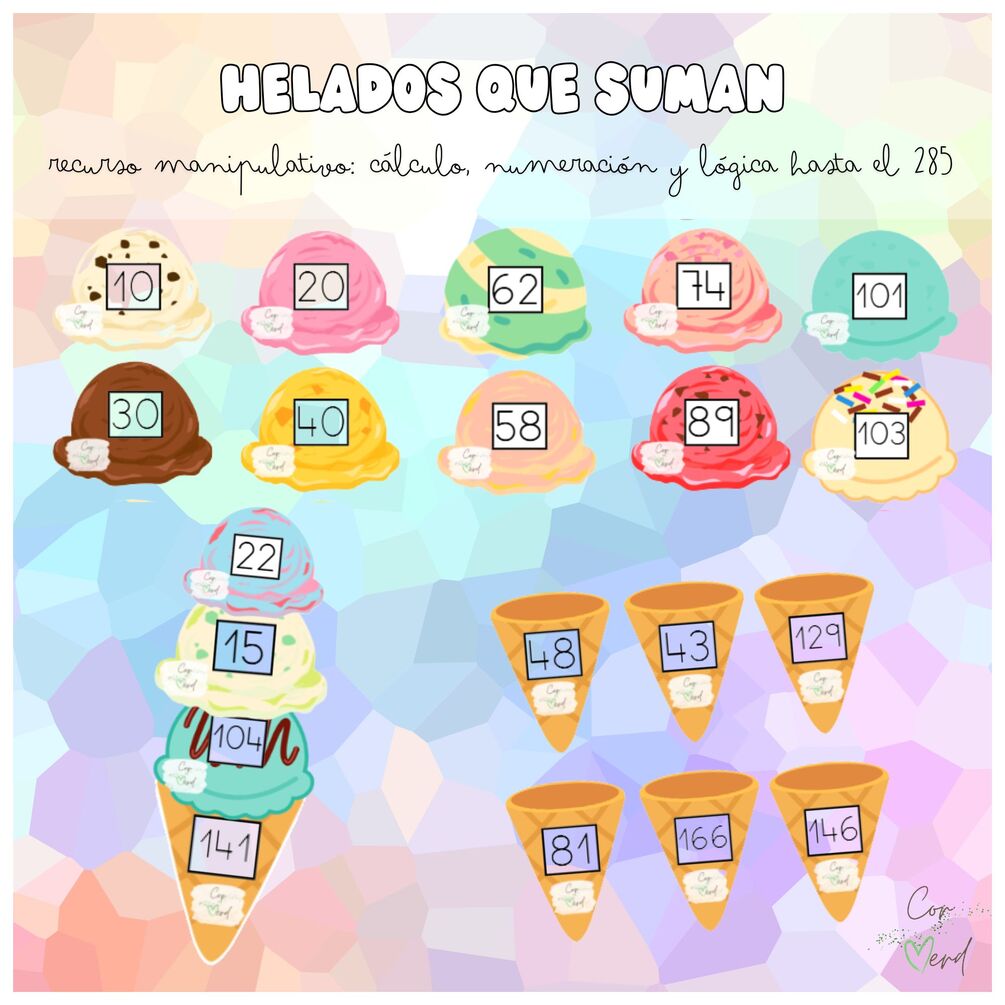 En este juego manipulativo, los niños y niñas deben unir bolas de helado de diferentes sabores, cada una con un número, para conseguir que la suma dé el resultado que aparece dentro de la galleta del cucurucho. A medida que combinan bolas y prueban diferentes opciones, desarrollan el cálculo mental, la lógica y la atención, todo mientras juegan en un entorno divertido y creativo inspirado en una heladería, con numeración hasta el 285.